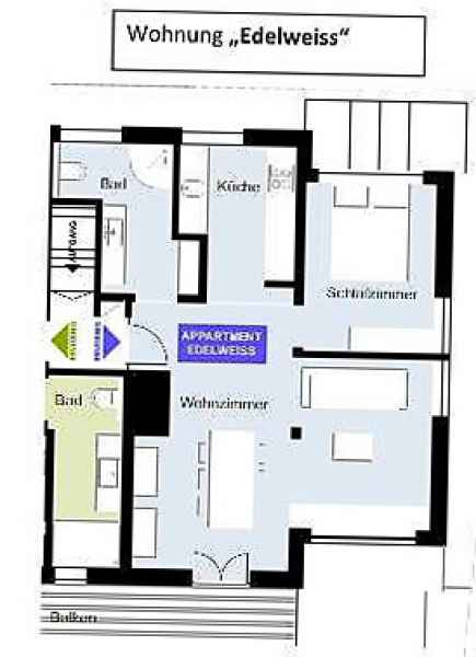 Wer die Berge liebt, liebt die Natur, liebt die vielen verschiedenen Blumen. Die mit viele zum Detail ausgestattete Wohnung verfügt ebenso wie die Wohnung „Gipfelstürmer“ über ein separates Schlafzimmer und ein komfortables Schlafsofa, welches im Wohn- und Essbereich steht. Auch im „Edelweiss“ gilt, dass alles komplett ausgestattet ist. WLAN ist selbstverständlich, das TV-Gerät ist mit Smart-TV ausgerüstet. Auch das „Edelweiss“ verfügt über einen kleinen Balkon. Das moderne Bad ist mit einer Dusche ausgestattet.